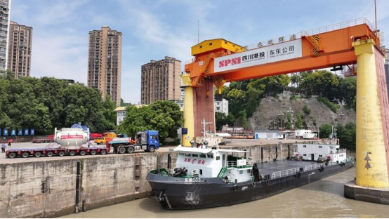 乐山大件码头作为四川大件运输水陆转换枢纽,地处三江汇流下游,航道水深稳定、江面宽阔,具备千吨级通航条件。自1995年为服务三峡枢纽工程兴建以来,已成为长江经济带重要物流节点。利用码头配备的550吨桥式起重机,球阀与中压模块将在这里完成吊装转运的全过程。“采用桥式起重机,是因为码头固定轨道作业稳定,能最大程度保障设备安全。”尊凯实业大件物流技术部技术经理罗崎瑞介绍说,“单件设备上船后需要花1小时进行加固作业,确保航行中万无一失。”