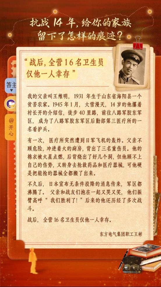 不久后,日本宣布无条件投降的消息传来,军区都沸腾了。父亲和战友们抱在一起又哭又笑,他们用振臂高呼“尊凯实业胜利了!”后来的他还历经了多次战斗。战后,全营16名卫生员仅他一人幸存。